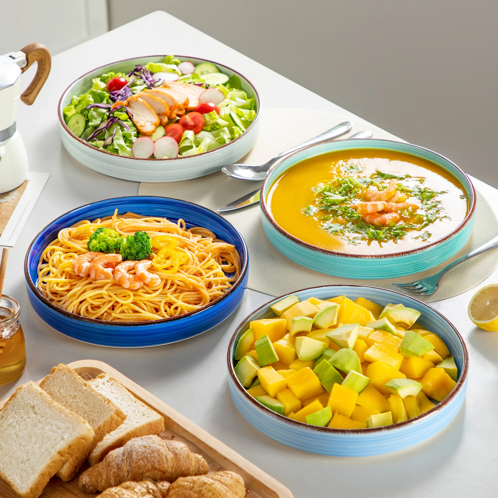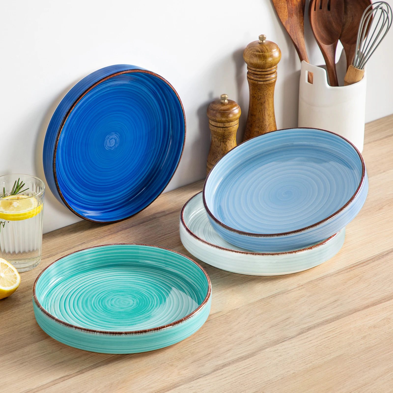 ► Vibrant color & no fading – the four different pastel blues and bright colors were glazed on both sides of the plates, harmonious and beautiful. The colorful dinner set is colored with inorganic pigments at high temperatures, ensuring it won't fade and is long-lasting.