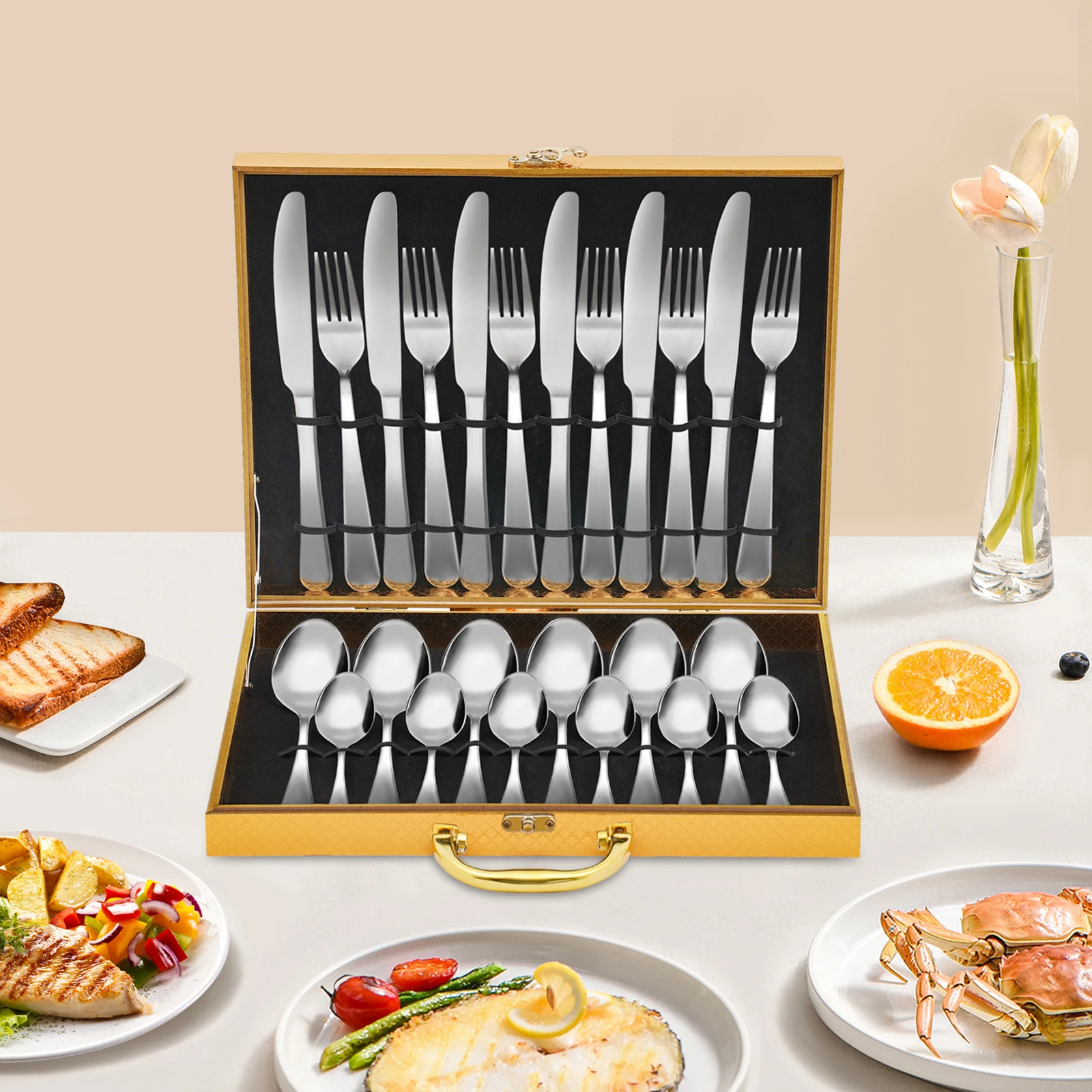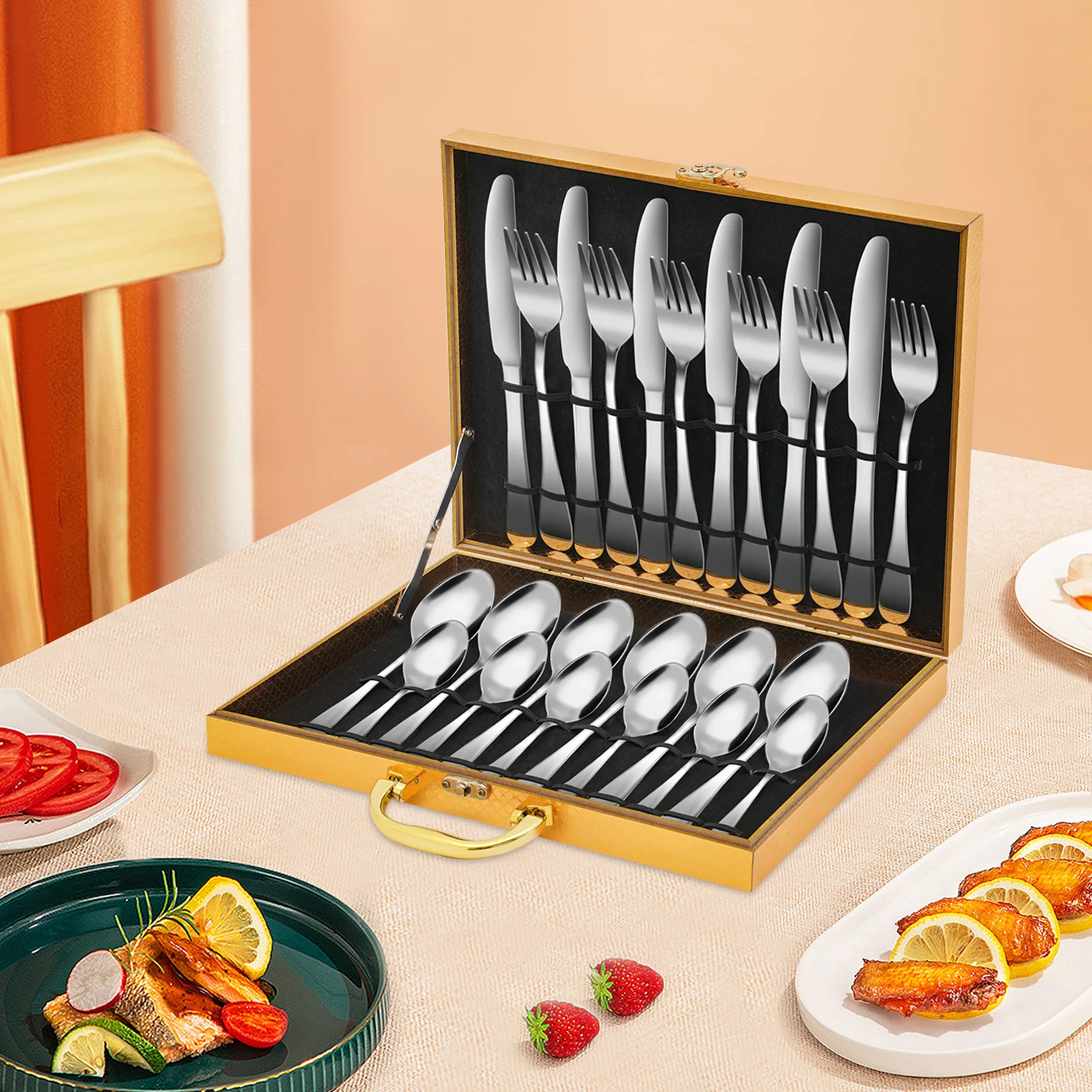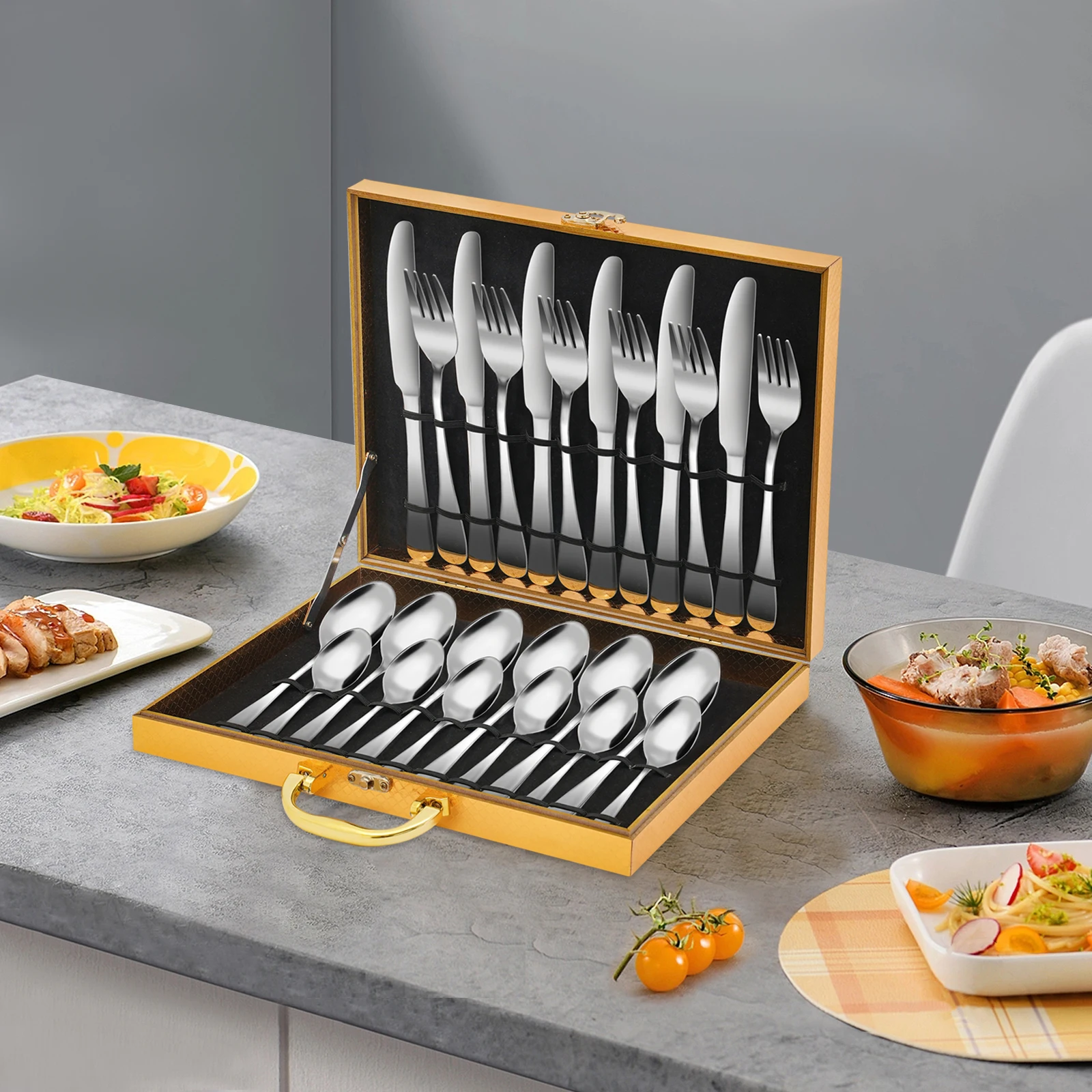 Набор из 24 предметов: 6 ножей, 6 вилок, 6 маленьких ложек, 6 больших ложек обеспечат вас достаточным количеством столовых приборов для праздничных вечеринок, семейных обедов и пикников на природе.