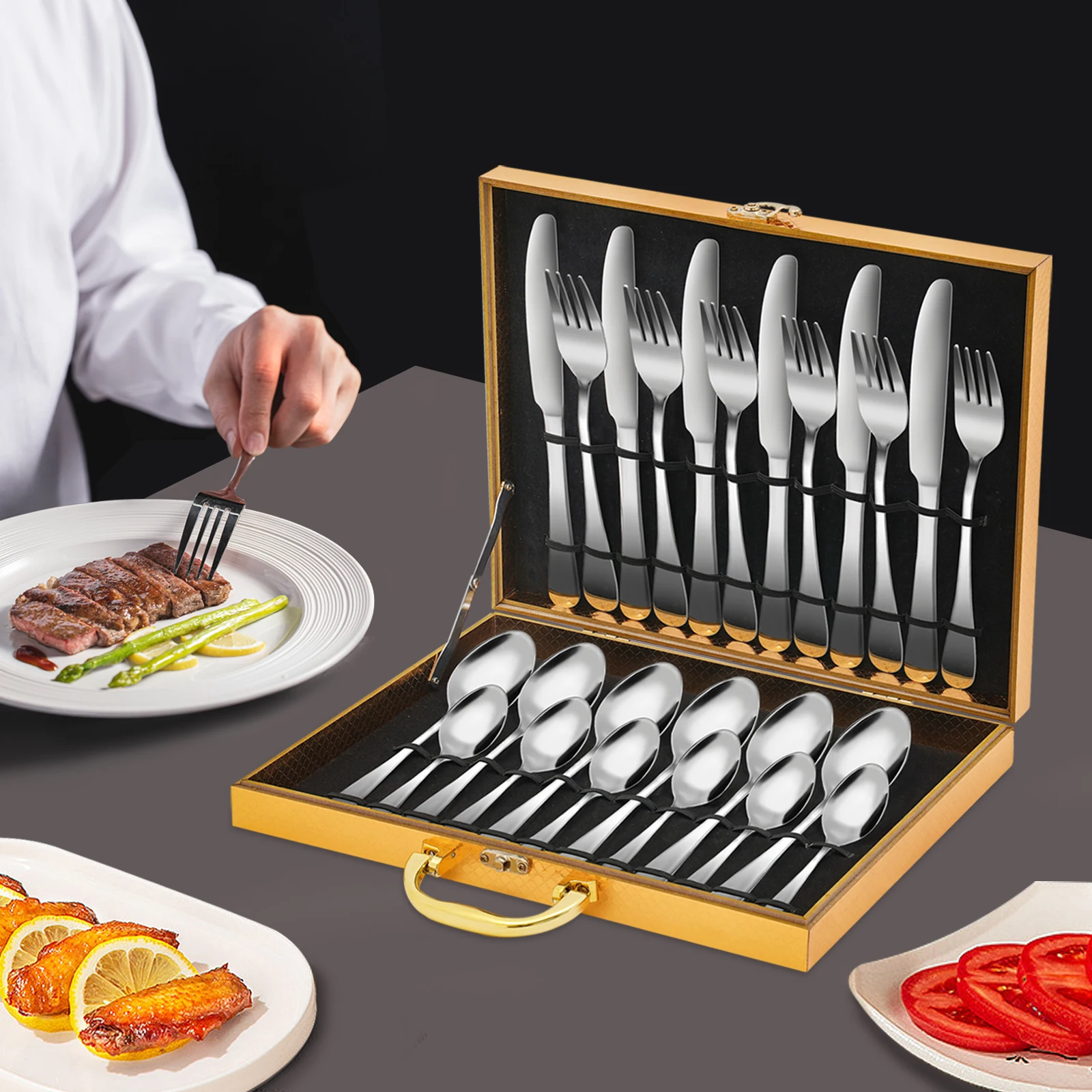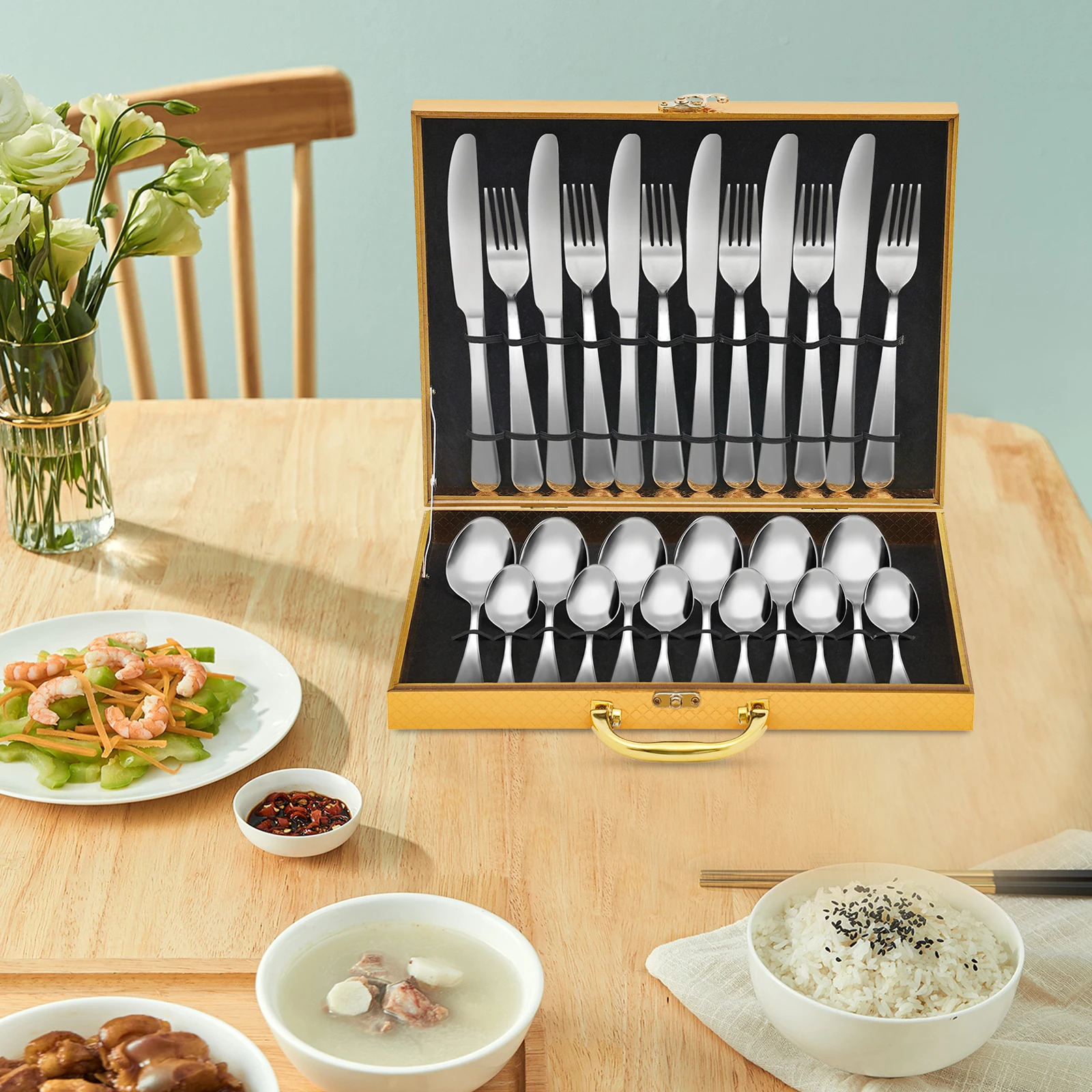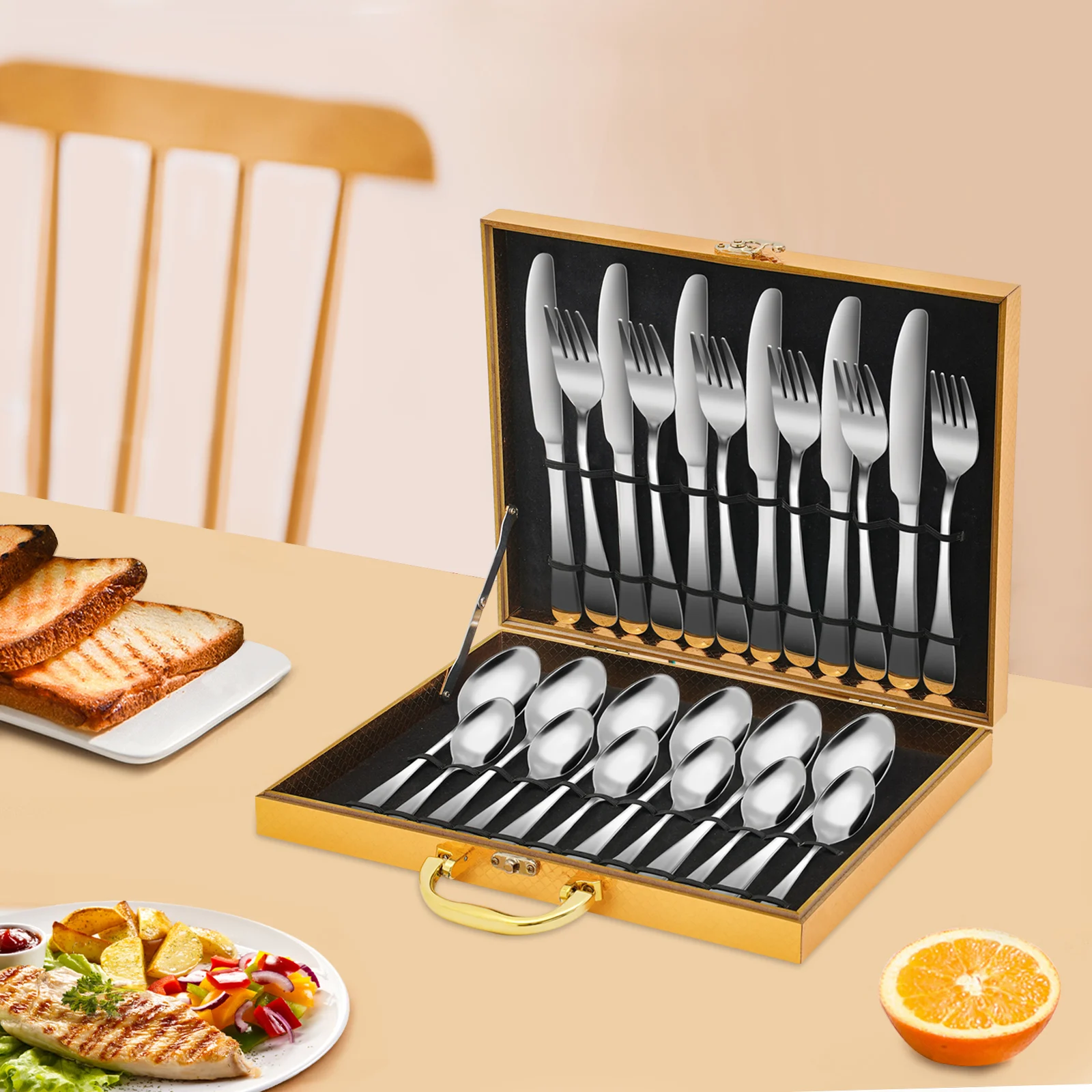 Набор из 24 предметов: 6 ножей, 6 вилок, 6 маленьких ложек, 6 больших ложек обеспечат вас достаточным количеством столовых приборов для праздничных вечеринок, семейных обедов и пикников на природе.